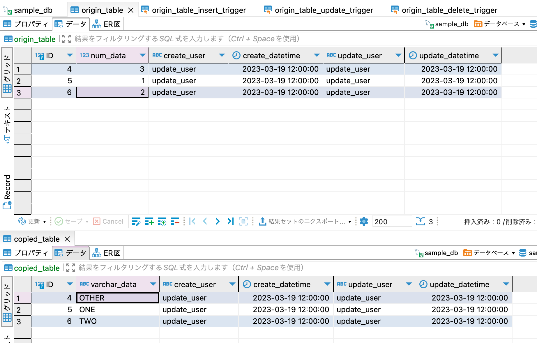 origin_table.num_dataカラムに入る数字をcopied_table.varchar_dataカラムへコピーしますが、そのとき数字を文字列に変換するようにトリガーで設定します。